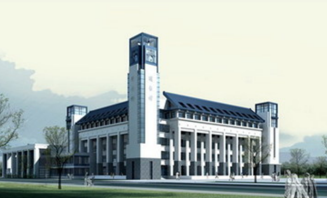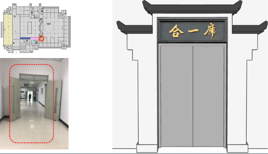大门:现场只是普通的一扇大门,从图书馆一楼大厅进来,没有特色;现在计划在墙、顶上采用徽派“马头墙”造型,园林式匾额,顺应整体的徽派建筑风格,同时也起到导向作用。