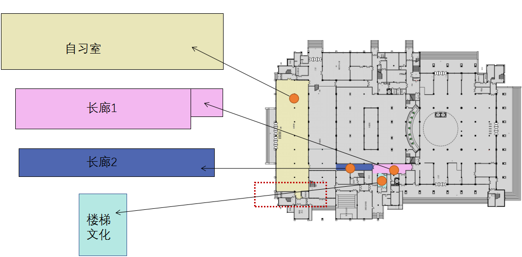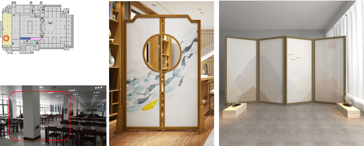图书馆自习室屏风隔断:将整个空间划分为现代简约风格、中式风格、美式风格、新古典风格,形成半开放空间,营造更舒适的读书氛围。