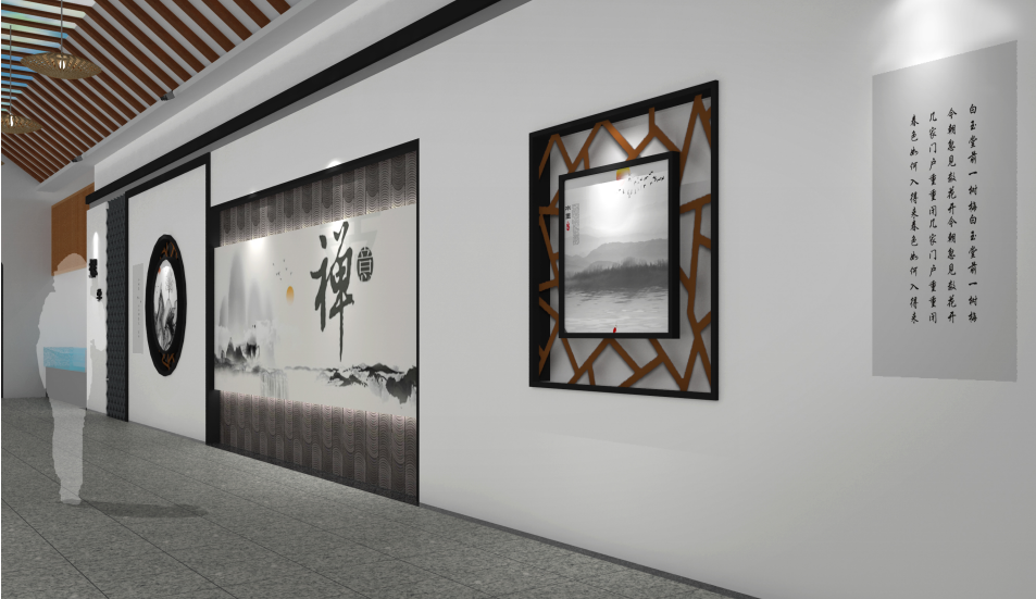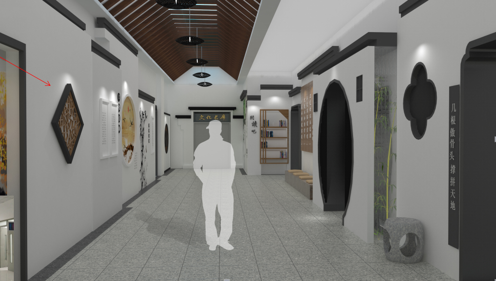 大门文化长廊:现场墙面只有书画装饰,外加一些消防装备,显得过于单调,同时还有柱子露出,有些凌乱感;计划将此处做出凹凸有致的“马头墙”造型,结合园林元素中的“漏窗”、竹子等植物。