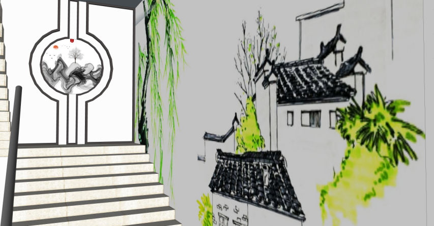 楼梯平台文化:墙面采用月亮门花格、水墨画装饰。