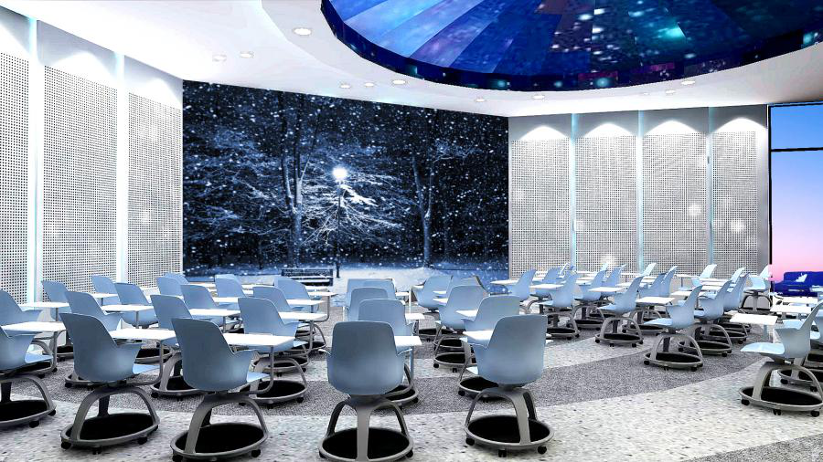 未来教室选择多功能的学生椅,灵活利用,满足不同教学空间需求,顶部圆形浩瀚画面设计上结合前墙大屏,在空间上营造科技的氛围,让学生在学习中和交流中能够积极探究本源。