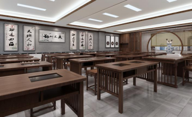 书法教室简约典雅,入门处设计隔断配合中式边几制造不一样的韵味,给人一种耳目一新的感觉。电子书法桌满足多功能需求,满足日常教学中书画、国学朗诵等多功能的需求,是传承传统文化的多元教学空间。
