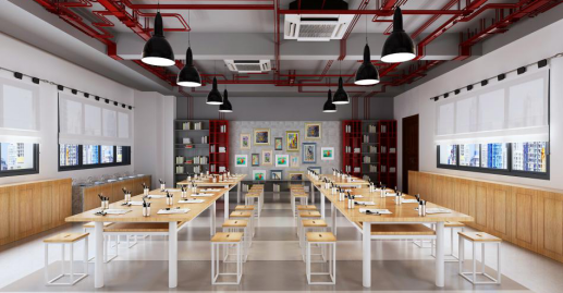 美术教室的设计设计上,采用了中国红、原木、铁艺等工业风的一些元素,是让学生美术灵感落地的一个空间。
