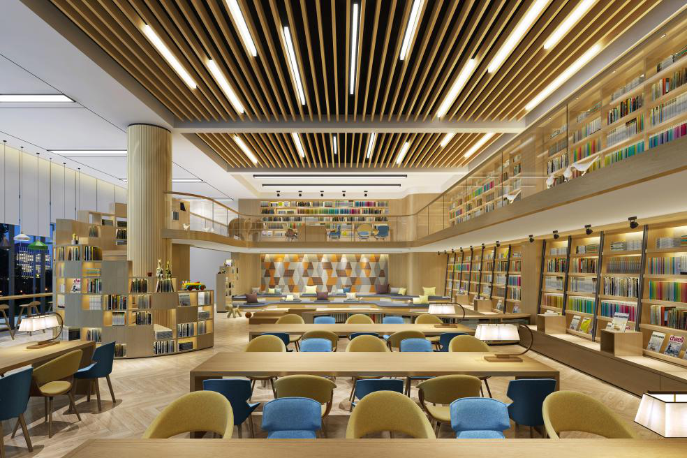 400平图书馆设计了小二层,在墙边设计壁式书架,上下书籍贯通,可谓巧妙又实用。书架下设计坐凳,做到随处有书,随处可读。
